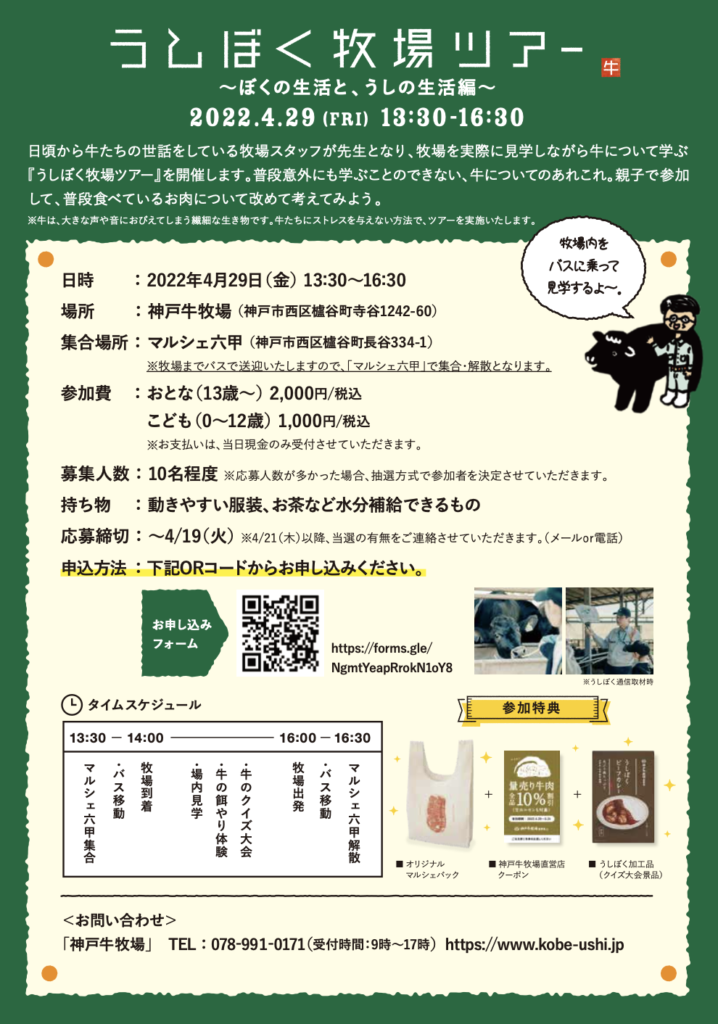 ※牧場までバスで送迎いたしますので、「マルシェ六甲店」で集合・解散となります