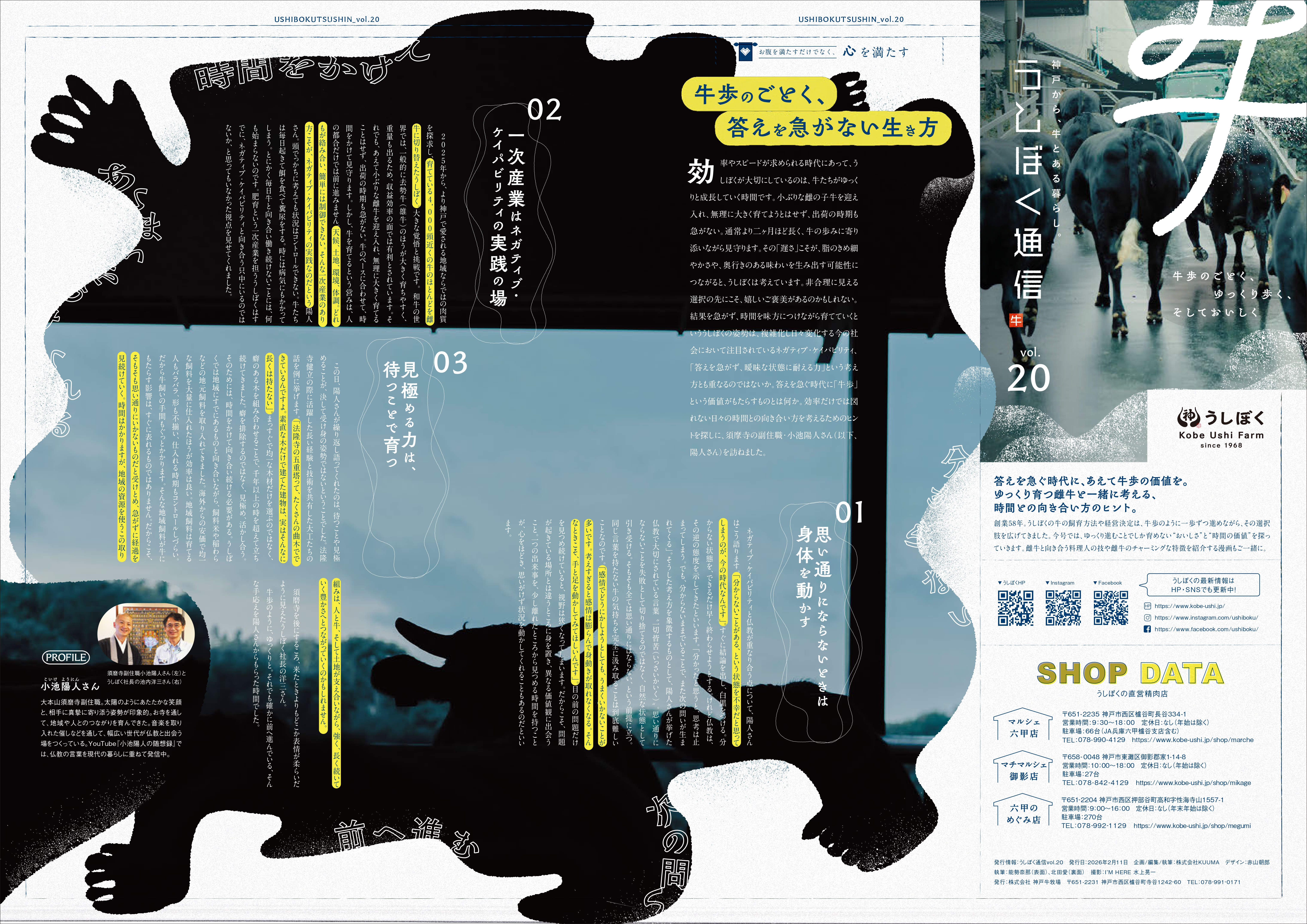 創業58年。うしぼくの牛の飼育方法や経営決定は、牛歩のように一歩ずつ進めながら、その選択肢を広げてきました。今号では、ゆっくり進むことでしか育めない“おいしさ”と“時間の価値”を探っていきます。雌牛と向き合う料理人の技や雌牛のチャーミングな特徴を紹介する漫画もご一緒に。