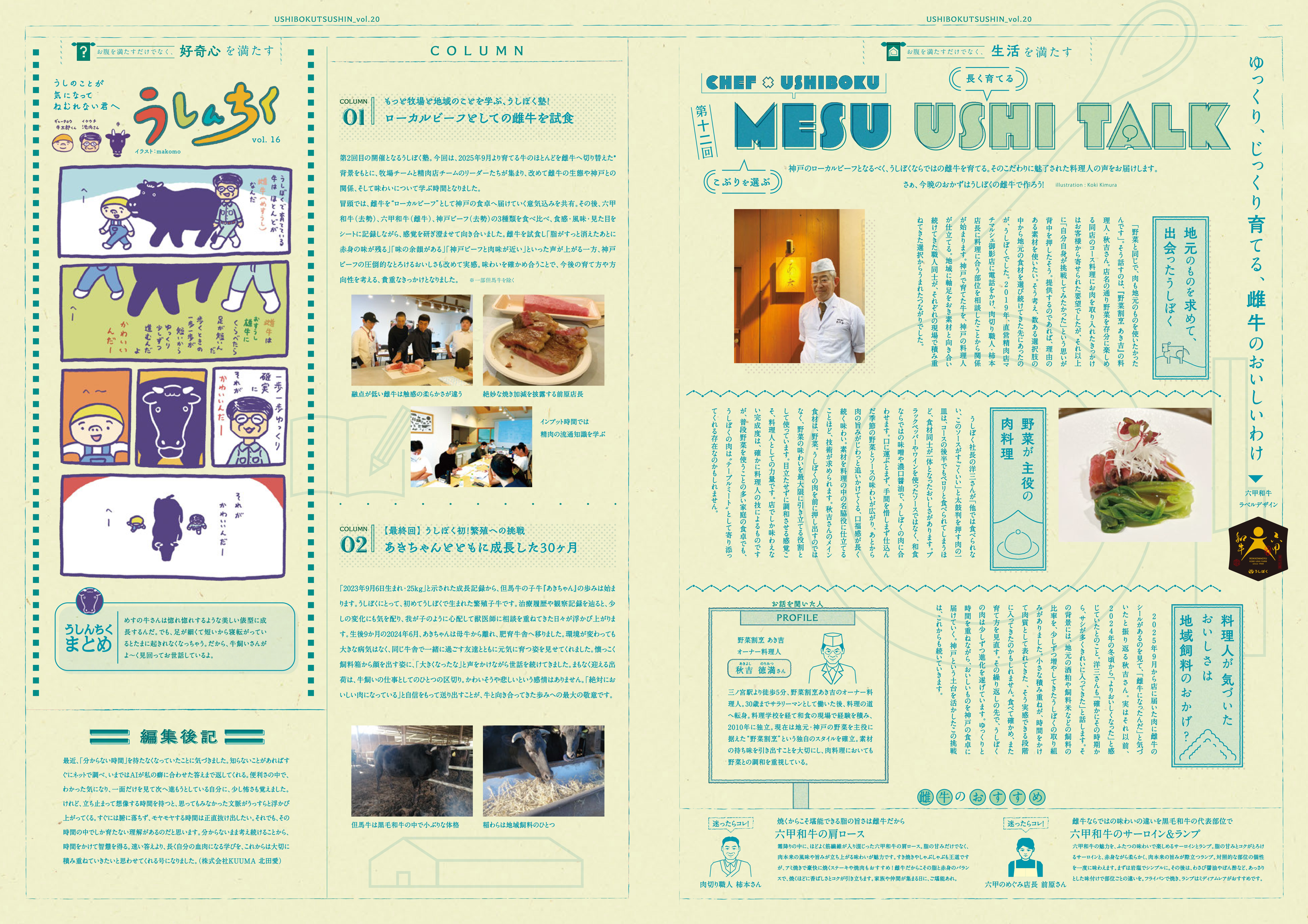 “牛と人と工夫を、考える”をテーマに、種のかけあわせに思考を巡らせた今号。オーストラリア生まれのアンガス種と、日本が誇る黒毛和種の交雑種である六甲牛。うしぼくが六甲牛と出会うまでの奔走劇や、その味わいに惚れ込んだシェフのインタビュー、うしぼくスタッフによるマニアックな肉トークなどをお届けします。
