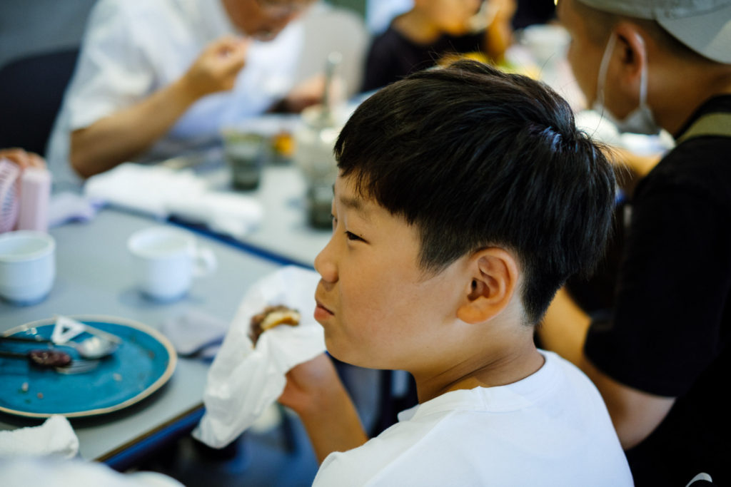 牛飼いさんと参加者の距離が少しずつ近づいていくのを感じつつ、お楽しみの食事時間がやってきました。「うまい!」「やわらかい!」と、子どもたちから嬉しい声がちらほら。大人たちからは「思っていたより脂っこくない」「肉感がしっかりあって美味しい」など、実際に食べたからこその言葉もいただけました。他にも、牛飼いさんと参加者たちが混ざり合う、印象的な場面がたくさん。「こっちも食べてみる?」と、牛飼いさんがこどもにハンバーガーをおすそ分けする場面や、牛飼いさんと子どもが将来の夢について語り合う場面も。神戸ビーフを味わってもらうべく開いた座談会でしたが、食べ手と作り手の距離がグッと縮まり、牛飼いさん一人一人の人柄にも触れてもらえた時間になりました。日常的にうしぼくの牛飼いさんたちとコミュニケーションをとっている私たち編集部としては、そんな牛飼いさんたちの人柄までまるっと感じていただける場を作ることができたのは、また違った嬉しさがありました。